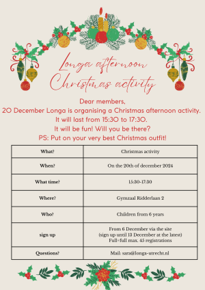 20 december organiseert Longa een kerstactiviteitenmiddag, het duurt van 15:30 tot 17:30.