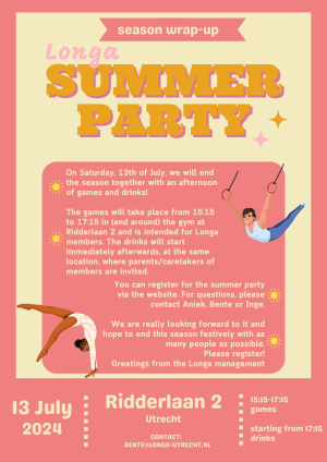 Lieve Longa leden, met de zomervakantie en daarmee de laatste lessen in zicht, is het ook weer bijna tijd voor het zomerfeest! Op zaterdag 13 juli vanaf 15:15 zullen we samen het seizoen afsluiten en de zomer inluiden.