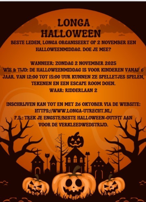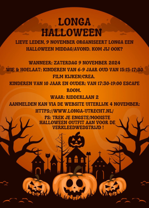 Lieve leden, 9 november organiseert longa een Halloween middag/avond waar we film gaan kijken en voor de oudere kinderen  een escape room. Kom jij ook?