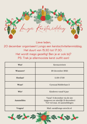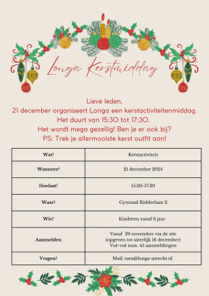 21 december organiseert Longa een kerstactiviteitenmiddag, het duurt van 15:30 tot 17:30.