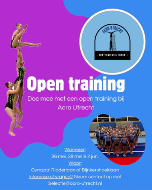 Naast de vele mensen die afscheid nemen van de Acro-tak zijn we blij dat we ook de komende jaren Acro-gym kunnen blijven aanbieden. We zijn blij dat we Vera en Nienke (oud Longa trainer op diverse groepen) als assistenten mogen verwelkomen en we zijn ook verheugd dat Erik en Loes aan blijven. Echter voor een stabiele toekomst is dit een smalle basis en daarom hebben we besloten tot een samenwerking met de Acro-tak van een andere Utrechtse turnvereniging: Fraternitas. Jaimy, de trainster van deze club, gaat de hoofdleiding op zich nemen en in samenwerking met hun turnsters en trainers is er een stabiele basis om acro-gym op een goed niveau in Utrecht te kunnen blijven aanbieden