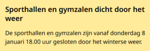 De gemeente heeft alle binnensportlocaties tot en met zondag gesloten vanwege instoringsgevaar. Dit betekent dat alle lessen van Longa komende dagen komen te vervallen. Vanaf maandag starten de lessen weer, tenzij de gemeente de zalen langer gesloten houdt.